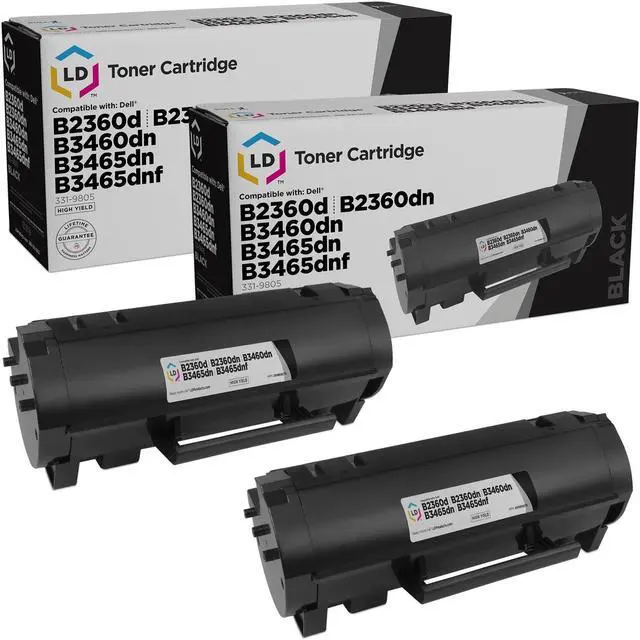 Save and print even more when you shop with LD Products! This offer includes (2) 331-9805 / MX11XH / C3NTP high yield black laser toner cartridges; they replace the 331-9803 / RGCN6 / 7MC5J standard yield black laser toner. Why pay more for brand name Dell toner? These toner cartridges are compatible with Dell Laser B2360d, B2360dn, B3460dn, B3465dn and B3465dnf printers. Please note, retail packaging may vary and this set will only work with printers purchased within the United States and Canada. The use of compatible replacement printing supplies does not void your printer warranty.