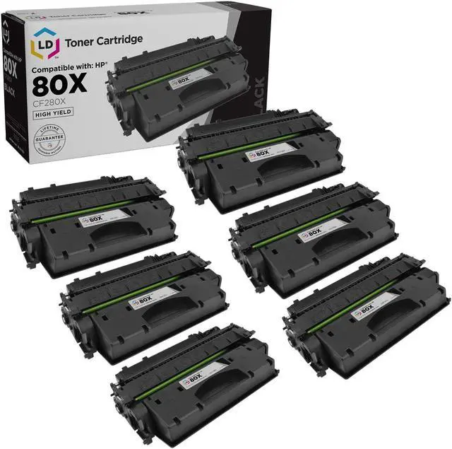 Compatible Replacements Included: HP 80X CF280X High Yield (Black, 6-Pack). Why pay more for brand name HP 80/X cartridge when our Compatible printer supplies deliver excellent quality results for a fraction of the price? Our Compatible cartridges for Hewlett-Packard are built to perform. This is a remanufactured cartridge and it was not manufactured by HP. This set works in the following HP LaserJet Pro 400 M401a, LaserJet Pro 400 M401dn, LaserJet Pro 400 M401dne, LaserJet Pro 400 M401dw, LaserJet Pro 400 M401n, LaserJet Pro 400 M425dn, and LaserJet Pro 400 MFP M425dw. Our cartridges are good for home, office or when you're running a business. Our products are put through a rigorous testing process where they are monitored for quality and reliability. Knowing the toner cartridge that works most efficiently with your printer model is important. Please note, retail packaging may vary and these cartridges will only work with printers purchased within the United States and Canada. The use of compatible cartridges does not void your printers warranty and our cartridges are not manufactured by HP. We are the exclusive reseller of LD Products brand of high-quality printing supplies.