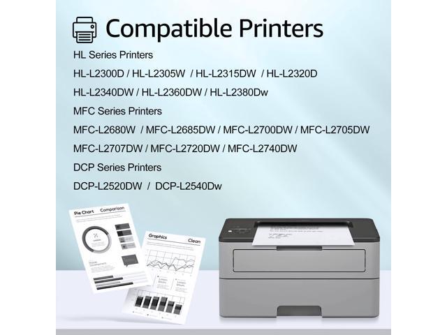 - Compatible for Brother Printer: HL-L2300D, HL-L2305W, HL-L2315DW, HL-L2320D, HL-L2340DW, HL-L2360DW, HL-L2380DW; DCP-L2520DW, DCP-L2540DW; MFC-L2680W, MFC-L2685DW, MFC-L2700DW, MFC-L2705DW, MFC-L2707DW, MFC-L2720DW, MFC-L2740DW Printers.