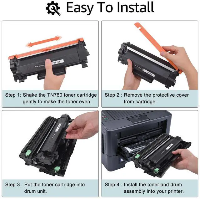 Installation Instruction: 1) Before use, shake the new toner cartridge horizontally from side to side for several times to make sure the toner powder is well distributed. 2) Please remove the orange protective cover from the toner cartridge. 3) Install the toner cartridge into correct position of the drum unit. 4) Put them into the printer together. Start Printing.
