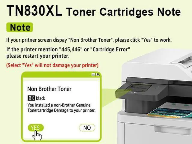 • Tips:When the printer shows "Non Brother Toner", please click "Yes". When the printer shows "445,446" or "Cartridge Error", please restart the printer.