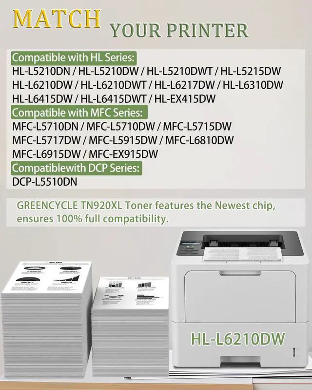 Compatible TN920XL Toner for Brother Printer: HL-L5210DN HL-L5210DW HL-L5215DW HL-L6210DW HL-L6217DW HL-L6310DW HL-L6415DW HL-EX415DW; HL-L5210DWT, HL-L6210DWT, HL-L6415DWT; DCP-L5510DN; MFC-L5710DN MFC-L5710DW MFC-L5715DW MFC-L5717DW MFC-L5915DW MFC-L6810DW MFC-L6915DW MFC-EX915DW