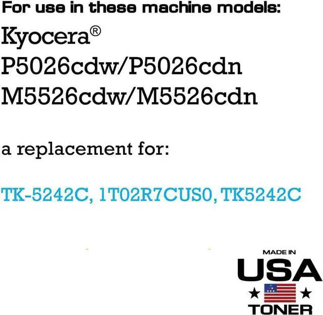 For use in Kyocera P5026cdw M5526cdw; Toner replacement for Kyocera toner type TK-5242C; For use in KYOCERA and COPYSTAR ECOSYS M5526cdn, M5526cdw, P5026cdn, P5026cdw