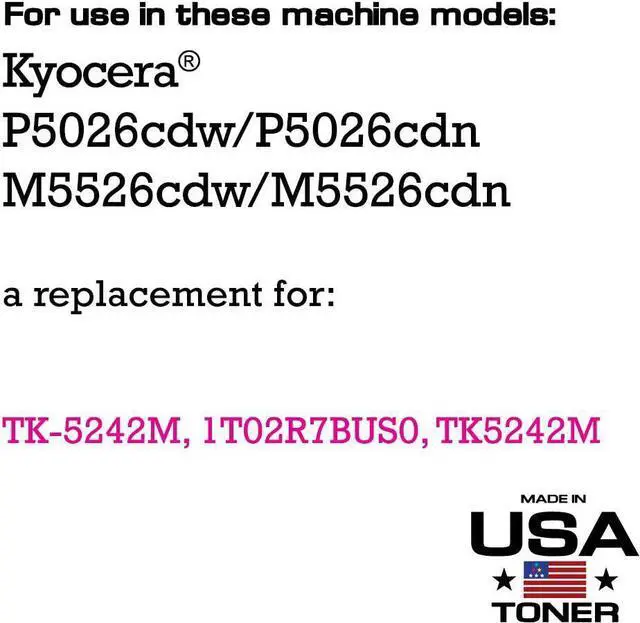 Compatible Replacement for: TK-5242K, TK-5242C, TK-5242M, TK-5242Y