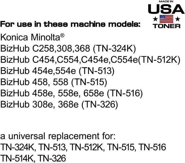 MADE IN USA TONER Compatible Replacement for use in Konica Minolta bizhub 308e, 368e, C258, C308, C368, C458, C558, TN512K, TN324K, TN513, TN514K, TN515, TN516, TN326 Universal (Black, 2 Cartridges)