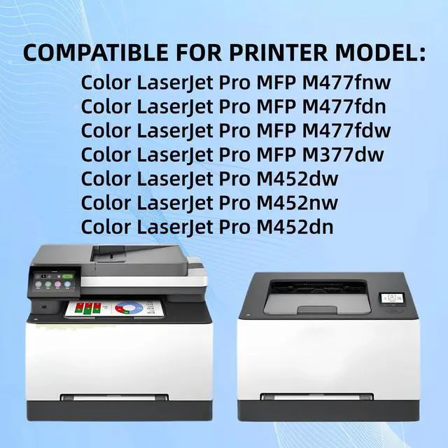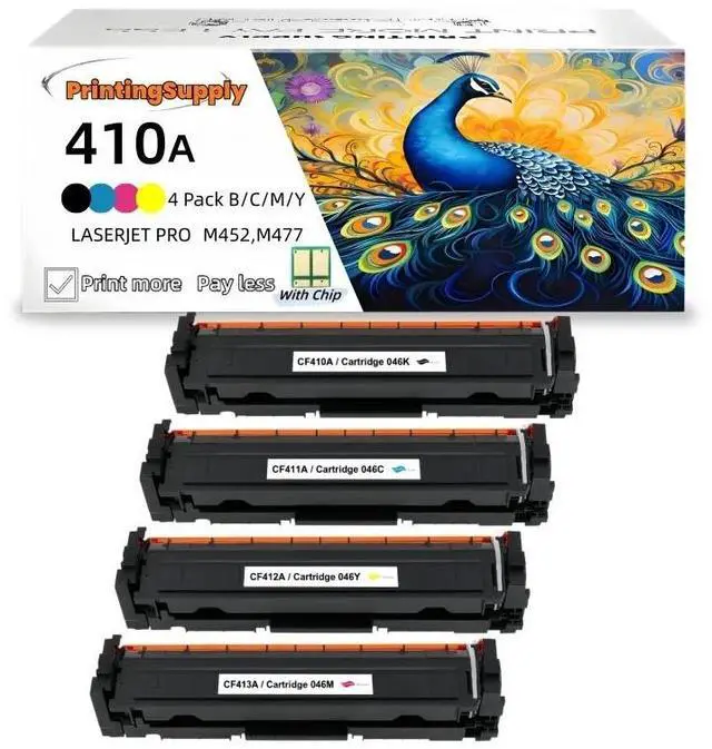 This 4 Pack includes new black, cyan, magenta, and yellow toner cartridges compatible with HP printers. The cartridges use the HP 410A model, with individual codes CF410A, CF411A, CF412A, and CF413A. These cartridges are designed for use with HP Color LaserJet Pro printers, including models M452dn, 452dw, 452nw, 377dw, 477fdn, 477fdw, and 477fnw. The use of these replacement cartridges does not void your printer's warranty. If you're not completely satisfied with your purchase, you can return your order within 30 days for a full refund or free replacement.