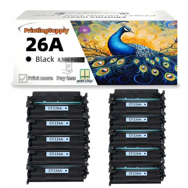 This offer includes a 10-pack of new compatible toner cartridges for HP CF226A 26A, designed for use with HP LaserJet Pro M402n, M402dn, M402dw, M402d, MFP M426fdw, M426fdn, and M426dw printers. The use of these replacement toner cartridges does not void your printer's warranty. They are professionally manufactured and come with a 100% Satisfaction Guarantee. Free and fast shipping is offered on all domestic orders. If you are not 100% satisfied with your purchase, you can return your order within 30 days for a full refund or free replacement.