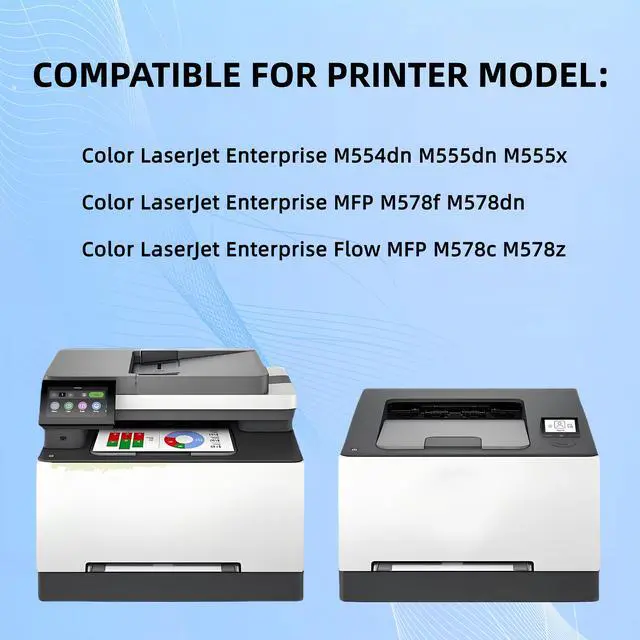 This offer includes a 4-Pack BK/C/M/Y High-Yield Toner Cartridge (WITH CHIP). These cartridges are designed for use with HP Color LaserJet Enterprise M578c, M578z, M554dn, M555dn, M555x, M578dn, M578f printers. These cartridges are professionally manufactured to provide reliable performance and high-quality prints. Additionally, the use of these replacement toner cartridges does not void your printer's warranty. We also offer free and fast shipping on all domestic orders. If you are not completely satisfied with your purchase, you can return your order within 30 days for a full refund or free replacement.