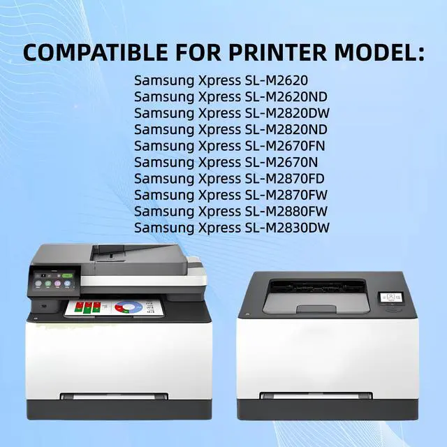 This offer includes a 4 Pack Black Toner Cartridge. These cartridges are designed for use with Samsung SL-M2870 SL-M2870FD SL-M2870FW, SL-M2880FW SL-M2880XAC, SL-M2620 SL-M2620ND SL-M2670 SL-M2670FN SL-M2670N, SL-M2830DW, SL-M2820 SL-M2820DW SL-M2820ND Printers. These cartridges are professionally manufactured to provide reliable performance and high-quality prints. Additionally, the use of these replacement toner cartridges does not void your printer's warranty. We also offer free and fast shipping on all domestic orders. If you are not completely satisfied with your purchase, you can return your order within 30 days for a full refund or free replacement.