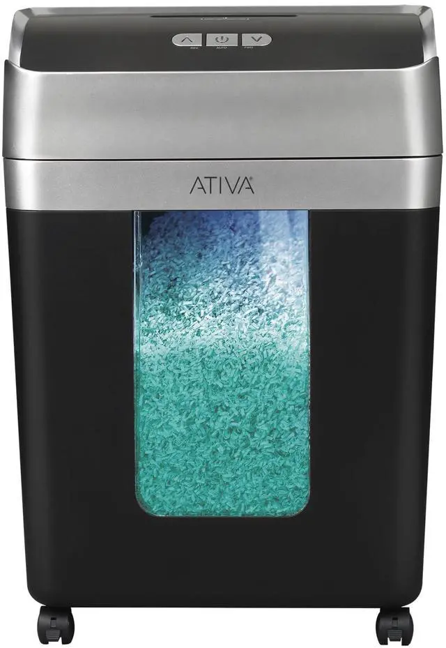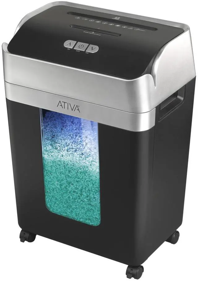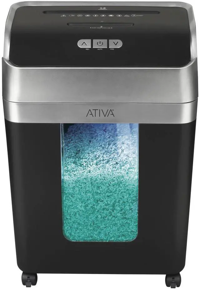 8.66" throat size can accommodate most documents. Automatically detects overloads and reverses jams. LED bin light shines inside bin when shredding begins, then fades out when completed. Backed by the manufacturer's 1-year limited warranty. Compatible with Ativa clear shredder bags (6 gallons), sold separately.