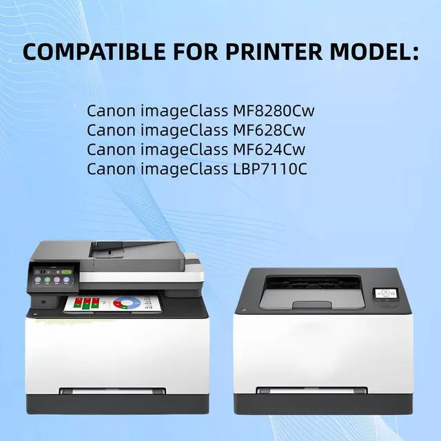 This offer includes a New Cyan Toner Cartridge. These cartridges are designed for use withCanon ImageClass LBP-7100CN LBP-7110CW MF8280 MF8230CN MF8280CW MF624Cw MF628Cw printers. These cartridges are professionally manufactured to provide reliable performance and high-quality prints. Additionally, the use of these replacement toner cartridges does not void your printer's warranty. We also offer free and fast shipping on all domestic orders. If you are not completely satisfied with your purchase, you can return your order within 30 days for a full refund or free replacement.