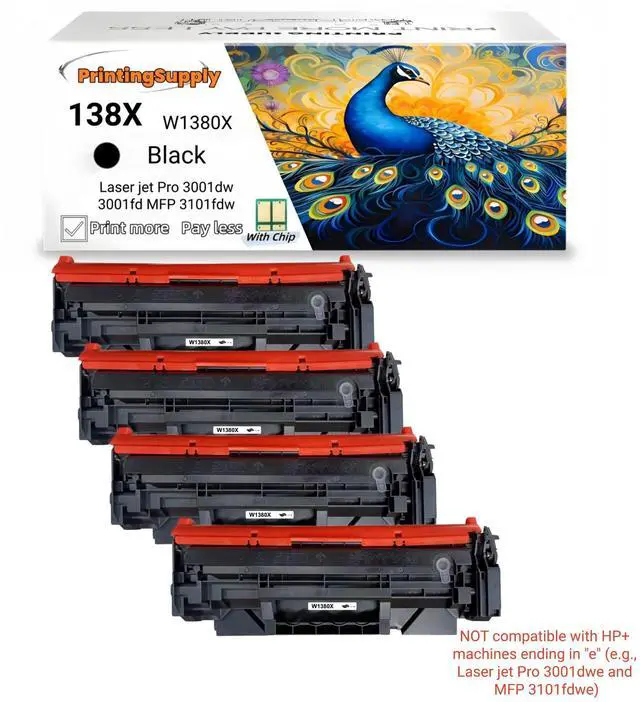 This compatible Toner cartridge set compatible for 138X HP black toner cartridges. It works with select HP Laser jet Pro 3001dw Laser jet Pro 3001fdw Laser jet Pro MFP 3101fdw and other compatible models. Each cartridge is designed for easy installation and delivers clear, consistent print quality for everyday home or office use. Manufactured to meet reliable quality standards, these compatible cartridges offer dependable performance and page yield suitable for regular printing needs. Backed by a 1-year limited warranty and customer support.