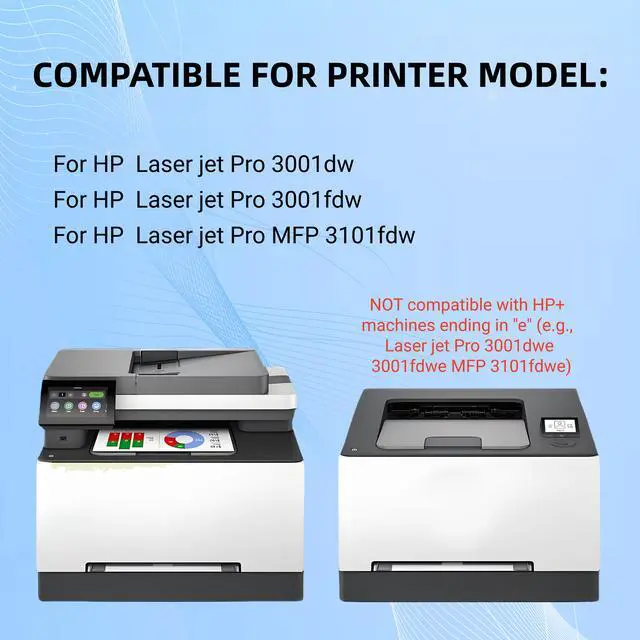 This compatible Toner cartridge set compatible for 138X HP black toner cartridges. It works with select HP Laser jet Pro 3001dw Laser jet Pro 3001fdw Laser jet Pro MFP 3101fdw and other compatible models. Each cartridge is designed for easy installation and delivers clear, consistent print quality for everyday home or office use. Manufactured to meet reliable quality standards, these compatible cartridges offer dependable performance and page yield suitable for regular printing needs. Backed by a 1-year limited warranty and customer support.