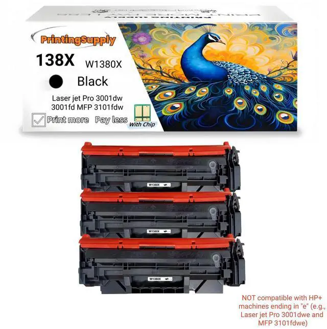 This compatible Toner cartridge set compatible for 138X HP black toner cartridges. It works with select HP Laser jet Pro 3001dw Laser jet Pro 3001fdw Laser jet Pro MFP 3101fdw and other compatible models. Each cartridge is designed for easy installation and delivers clear, consistent print quality for everyday home or office use. Manufactured to meet reliable quality standards, these compatible cartridges offer dependable performance and page yield suitable for regular printing needs. Backed by a 1-year limited warranty and customer support.