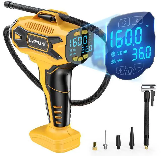 The compressor can reach 160 PSI, but in car mode, it’s limited to 60 PSI for safety. Use custom mode for 0-160 PSI. the bigger digital gauge will display both the desired tire pressure value and the current tire pressure and Low battery reminder