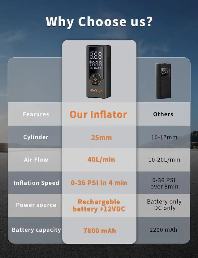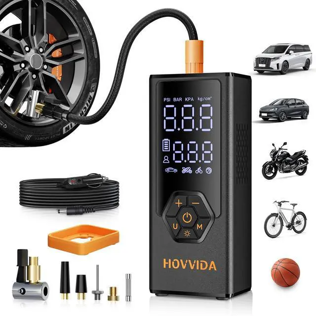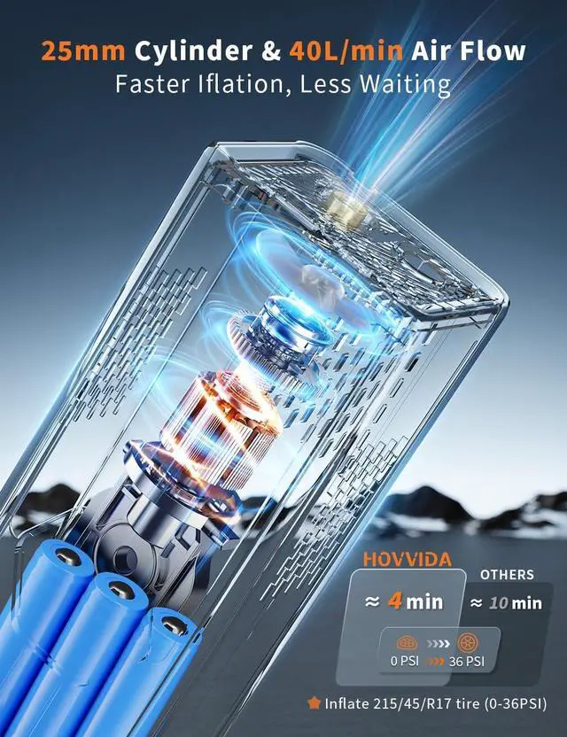 5X Faster Inflation Built in 25mm cylinder copper motor and with 40 L/min air flow, the portable air compressor can inflate tires 5X faster -inflating a 215/45/R17 car tire from 30 to 36PSI in just 48 seconds. Incredibly, the portable tire inflator can fill 4 standard car tires from 0 to 36 PSI. Ideal for MPV, SUV, car, light truck, motorcycle, bike, e-bike, ball, toys. Please note: HOVVIDA is not designed for high-volume inflation like air mattresses, paddleboards, or large truck tires.