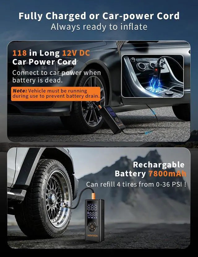 7800mAh Battery & Car Power CordEquipped with a high-capacity 7800mAh battery, the air pump provides sustained power for continuous, cord-free operation for extended cordless operation. Note: When charging, the tyre inflator cannot be turned on. Please unplug the charger and then turn it on. In case of a dead battery, a 118in DC 12V car power cable is included, long enough to cover four car tires, allowing you to inflate anytime. Important: Always keep your vehicle running while using the car cable to prevent battery drain.