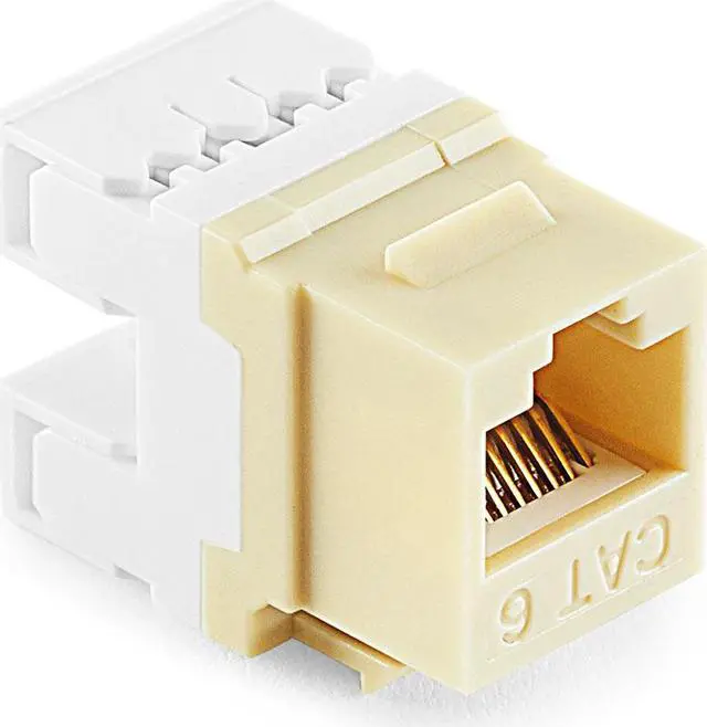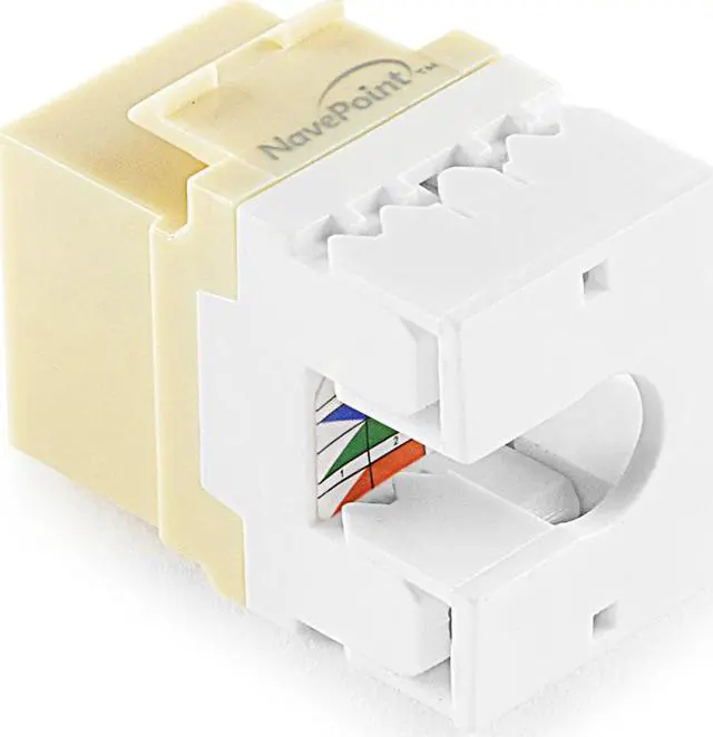 NavePoint RJ45 Keystone Jacks are standard size for use to connect solid 23 or 24 AWG cables into standard patch panels or wall plates with keystone blanks. The 110-type terminations are color-coded for both T568A and T568B wiring schemes for easy termination at a 180-degree angle that enables a compact keystone jack installation. Dual IDC modules can use 110 or Krone impact tools and come with dust caps to assist with cable strain relief. Constructed of high impact, fire-retardant high temperature thermoplastic with gold-plated contacts, these Keystone Jacks meet or exceed Category 6 performance in compliance with the TIA/EIA 568-C.