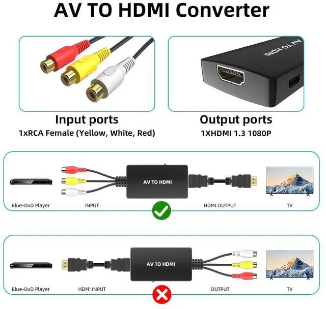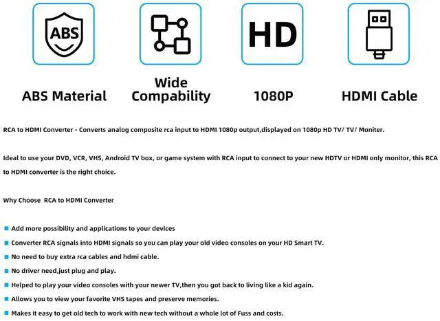Input: RCA, Output: HDMI. The RCA to HDMI can convert analog RCA composite to HDMI 720P/1080P (60HZ), rescuing your old equipment, making video come alive and giving a wonderful HD visual experience for you.
