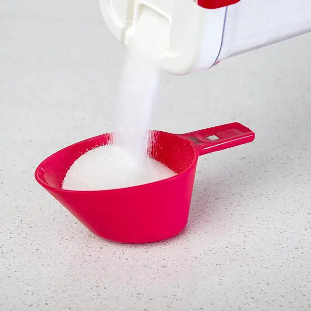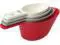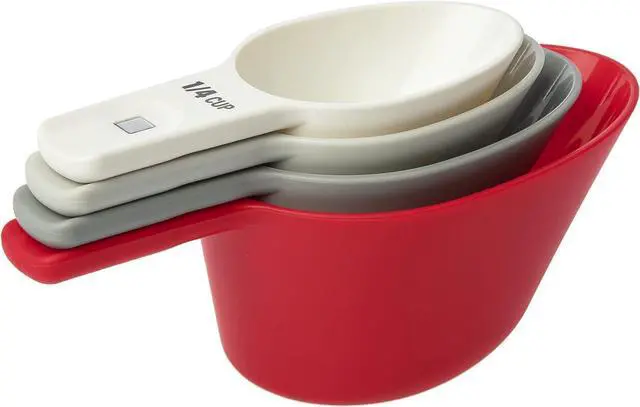 The 4-piece magnetic measuring cups are perfect for kitchen organization and product functionality. The set nests magnetically inside each other for easy storage and tidiness. The set includes 1/4 cup (50 ml), 1/3 cup (80 ml), 1/2 cup (120 ml) and 1 cup (240 ml).