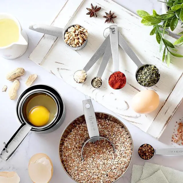 STACKEBLE AND ORGANIZED The cups and spoons each stacked in one bundle with a small - ring which helps to keep it together as a set after a full day of baking or cooking, plus nesting into each other beautifully, making them very compact and easy to storage. You can forget about missing one of the cups or spoons!