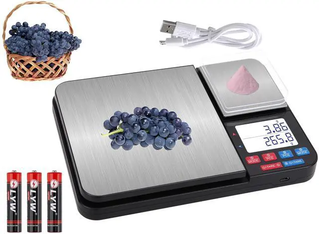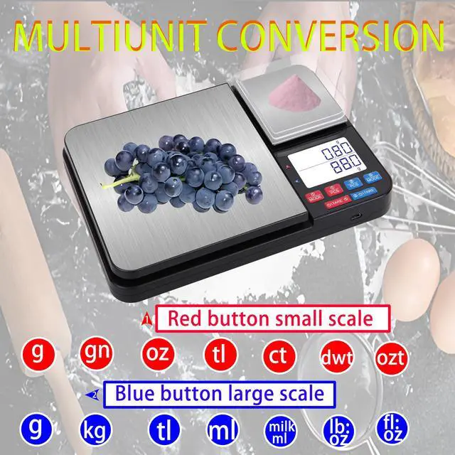 [ Two Scales with Two Accuracies, Max Capacity 22lb/10kg, ] The accuracy/range of the Large scale : 0.05oz/22lb ( 1g/10kg ). Small scale : 0.005oz/1.1lb ( 0.01g/500g ). The dual scale can meet different weighing accuracy requirements and can be operated simultaneously to improve efficiency.
