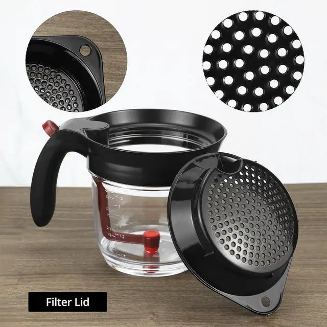 The 4 Cups Plastic Fat Separator with Bottom Release is designed to ensure that your gravy and sauces are healthier and free from unwanted fats. Made of durable and heat-resistant material, this separator features a silicone plug for controlled release, and a large handle for easy gripping. The separator also includes a top lid strainer for removing food debris and large particles. It's easy to clean, easy to use, and built to last, making it a valuable addition to your kitchen