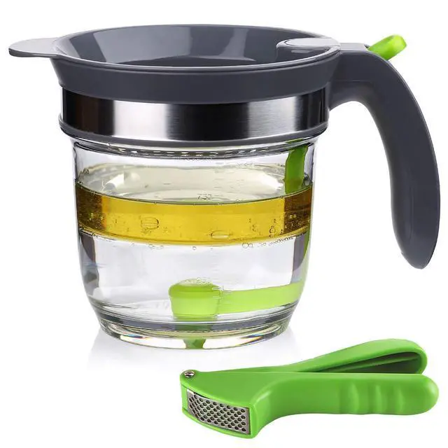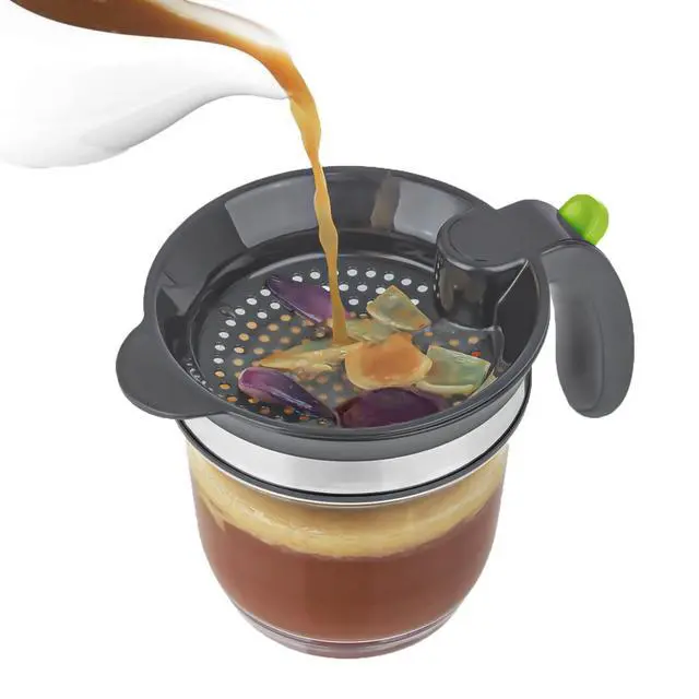 - Sauce or gravy is released from the bottom of Fat Separator; silicone plug controls the release of gravy and fat with large easy to grip handle.