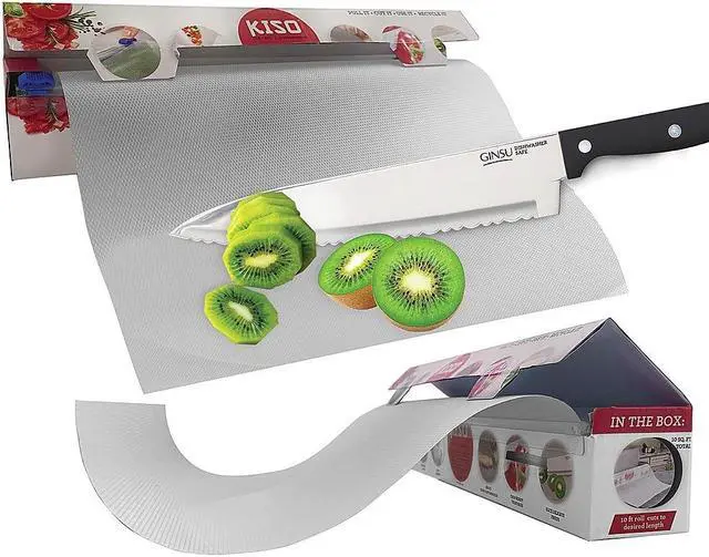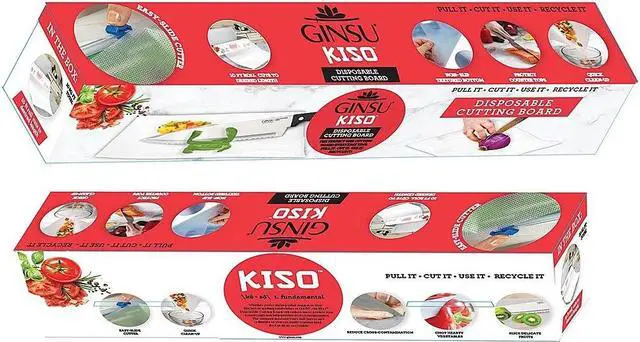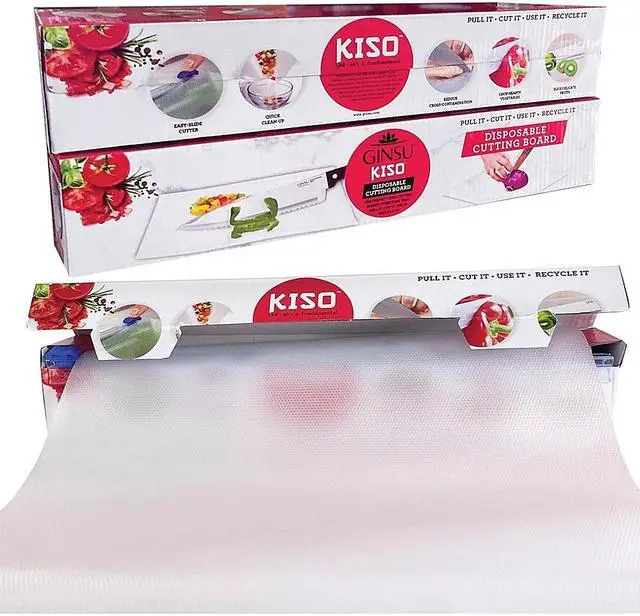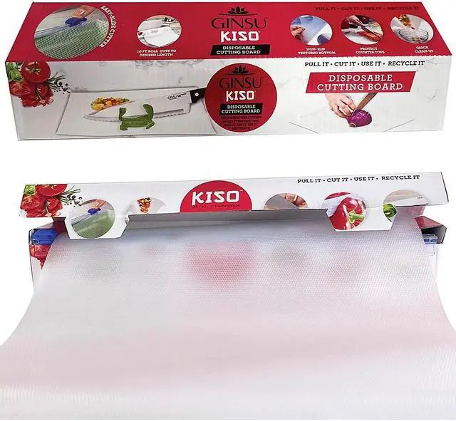 AV Imports - Ginsu GNZ-3005- Ginsu Disposable Kitchen Clear Cutting Chopping Designs Board with Knife and Containers. Designed to reduce messes and save time the Ginsu Disposable Cutting Board GNZ-3005 is a convenient compact companion. Whether you're on the road camping or working with foods prone to cross-contamination this roll of disposable cutting board is the perfect kitchen tool. The Ginsu cutting board comes in a convenient 10' roll that can be quickly and easily trimmed to a custom size with the built-in slide cutter. It's durable enough to use for chopping any food even hearty vegetables and meats and an anti-slip textured bottom helps to keep you and your countertops safe.
