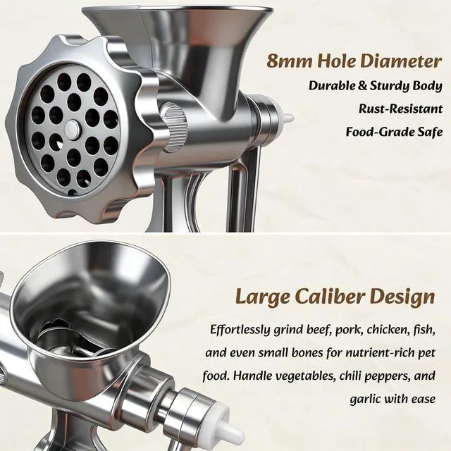 This heavy-duty manual meat grinder is designed to help you create fresh, homemade ground meat and sausages right in your kitchen. Crafted from high-strength aluminum, this meat mincer combines durability with a lightweight body that's built to last. The precision-engineered martensite steel blade ensures efficient grinding, while the circular arc inlet design allows for greater capacity and smoother operation. The robust one-piece structure provides exceptional stability during use, living up to its promise of being as steady as Mount Tai. A protective plastic cover safeguards the table clamp fixture, ensuring secure attachment to your countertop or table edge. Whether you're grinding beef, pork, or chicken, this manual grinder gives you complete control over the texture and quality of your meat. Perfect for making fresh burgers, meatballs, or homemade sausages, this versatile kitchen tool brings traditional meat processing into your home. The manual operation means no electricity required, making it ideal for everyday use or outdoor cooking adventures.