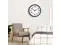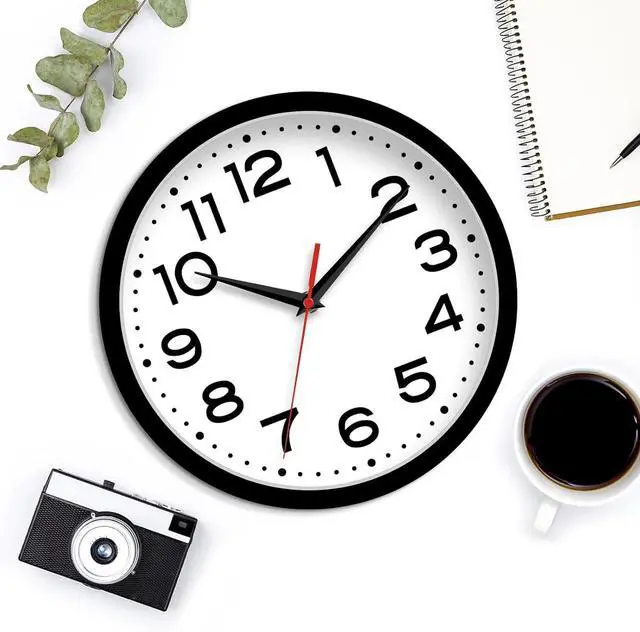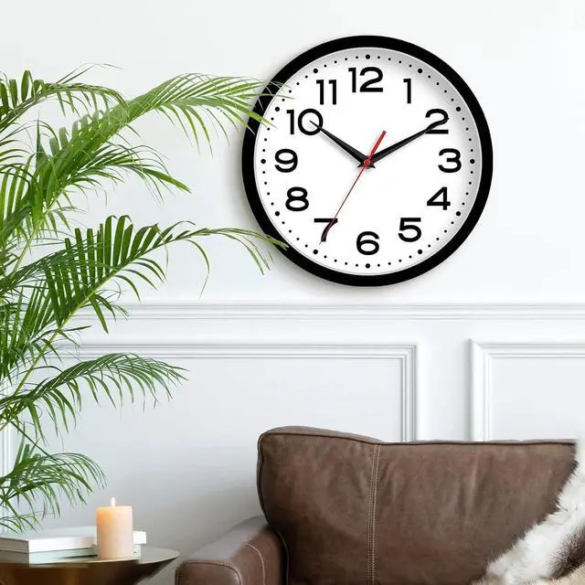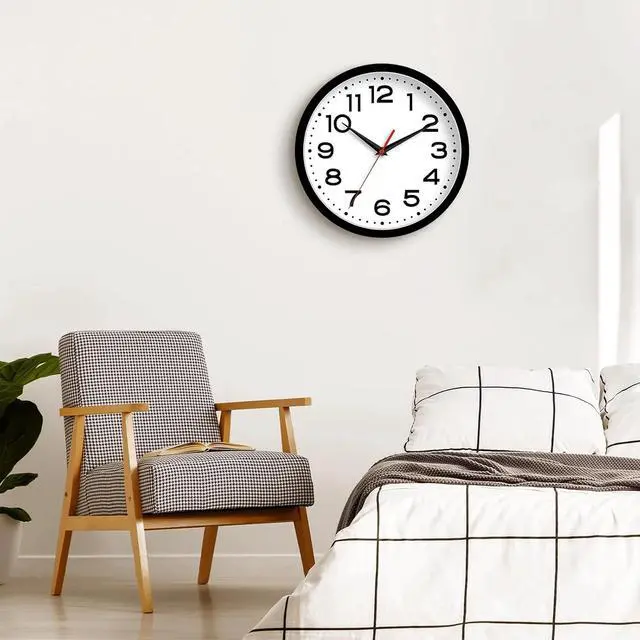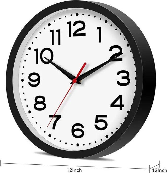 This modern, 12-inch round wall clock features a black frame and a white face with clear black numbers. It is battery powered and has a silent clock feature, making it perfect for any room in your home. The clock is easy to read and easy to hang, and its sleek design complements a variety of decor styles. Whether you're looking to add a touch of elegance to your kitchen, a touch of sophistication to your living room, or a touch of tranquility to your bedroom, this clock is a great choice.
