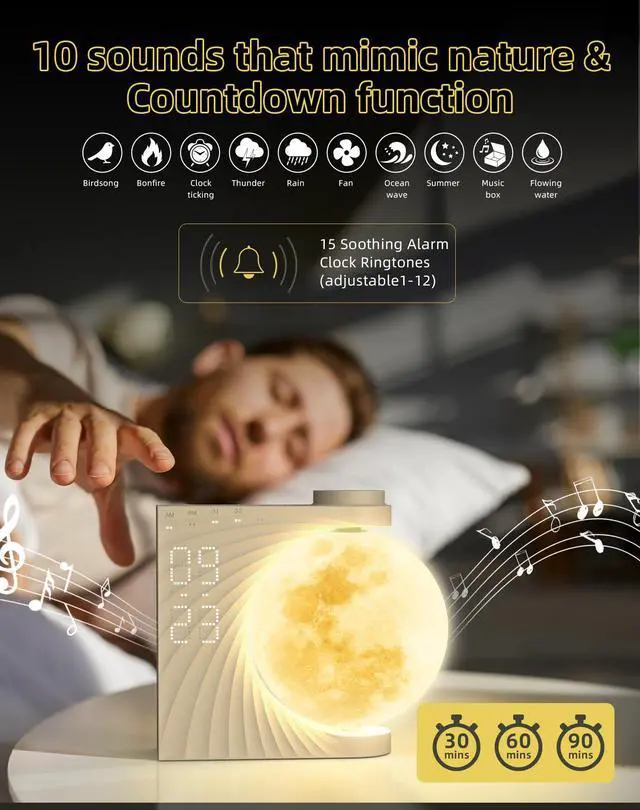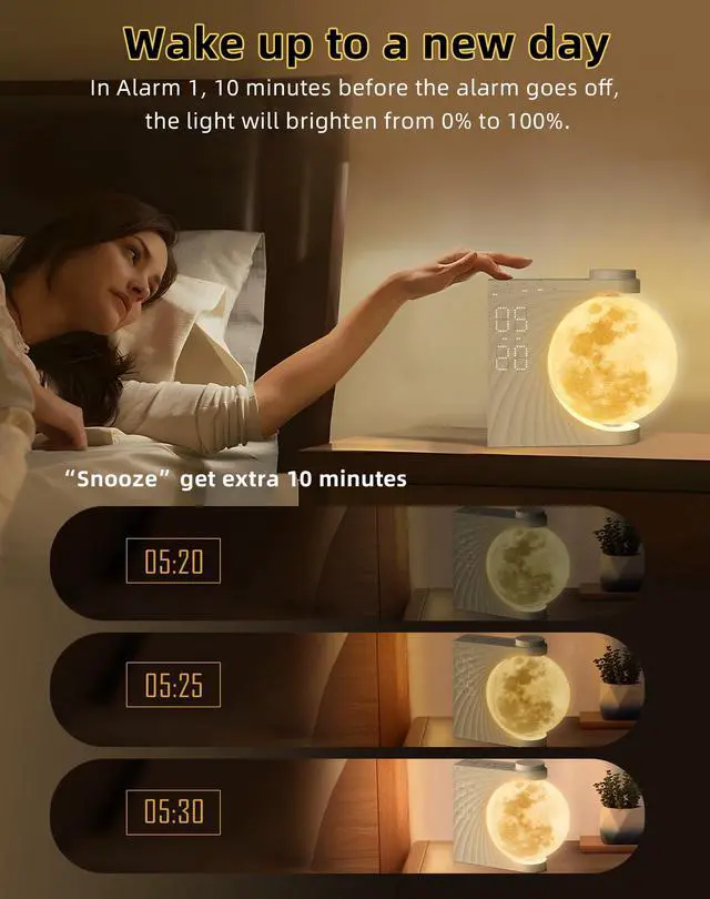 Gentle Sunrise Wake-Up: Light gradually brightens from 1% to 100% over 10 minutes (3000K warm white), syncing with your circadian rhythm for a grogginess-free morning. Heavy sleepers can add backup alarms with 10 nature sounds (birds, ocean, rain) or 5 melodic chimes.