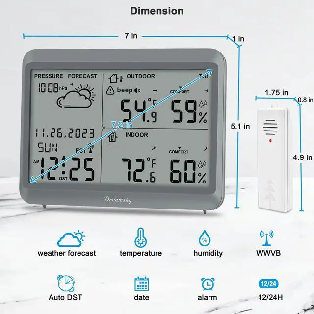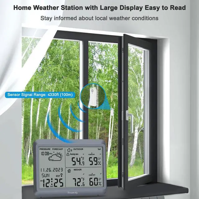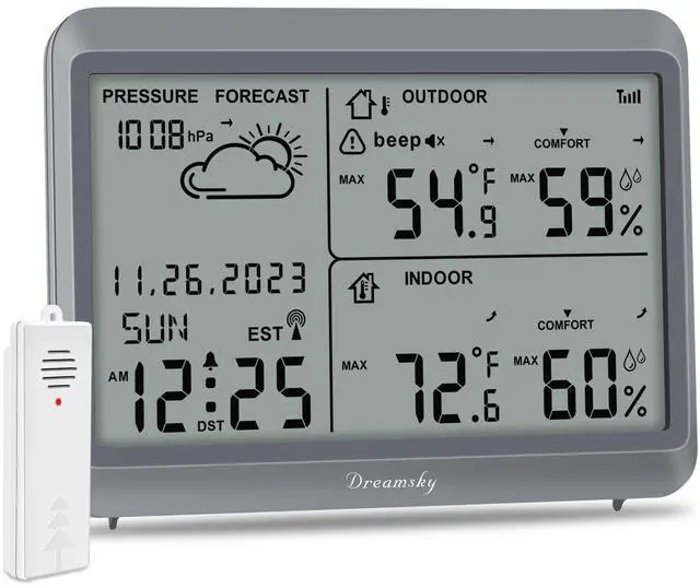 DreamSky wireless weather station features indoor outdoor temperature humidity gauge, air pressure, customizable high/low outside temperature alert with 2 alert modes, records max/min thermometer & hygrometer, keeps time & date with an atomic clock and can hook up to 3 sensors within 330ft.