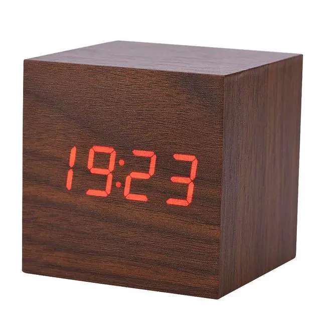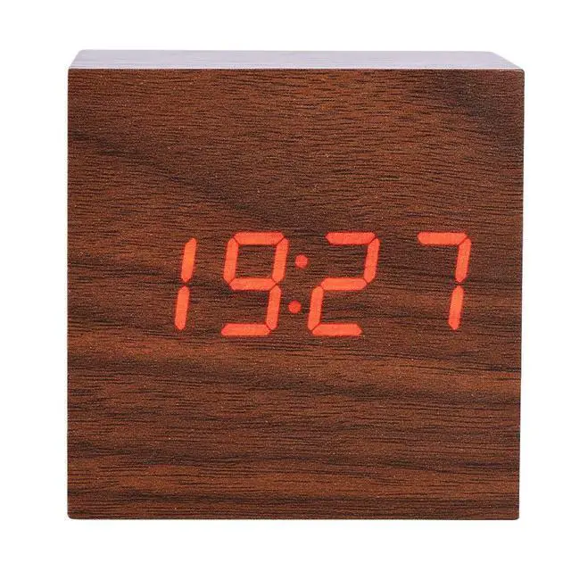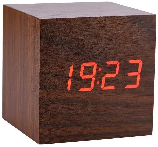 Digital Alarm Clock, with Wooden Electronic LED Time Display, 3 Alarm Settings,Temperature Detect, 2.5 inch Cubic Small Mini Wood Made Electric Clocks for Bedroom, Bedside (Brown wood + red light)