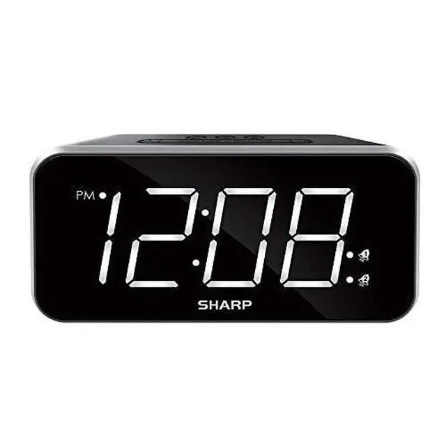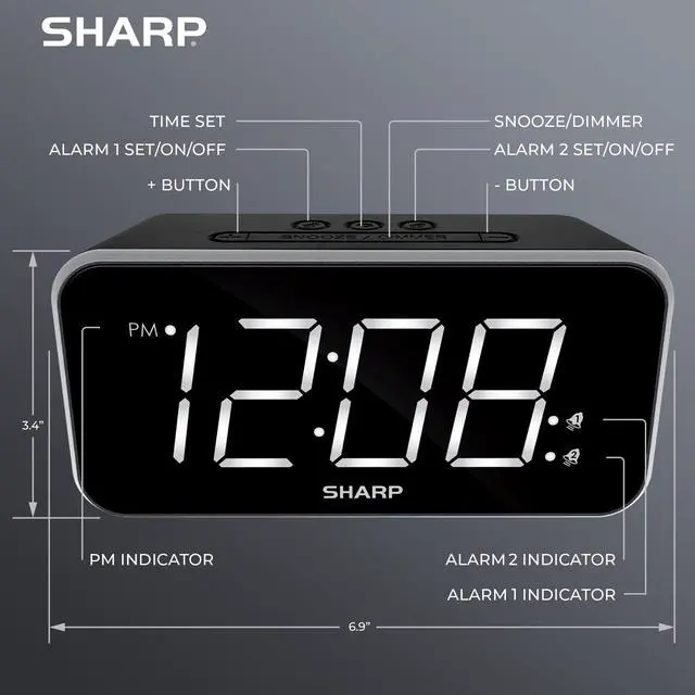 Sharp Dual Alarm with Jumbo Easy to Read 1.8” White LED Display with Black Finish – 3 Step Dimmer Control – Dual Alarms, Set Two Alarm Times - Battery Back-up – SPC736A. Jumbo 1.8” White LED display Extremely large display shines through the black finish. You may adjust the display brightness to your viewing pleasure with the three step dimmer control button. This is a bright clock but you are able to easily adjust the brightness. Set two separate Alarm times Set two alarm times; for example, set one alarm for the weekday and the other for the weekend. You can clearly see when the alarm is active when the alarm indicator is lit on the display.
