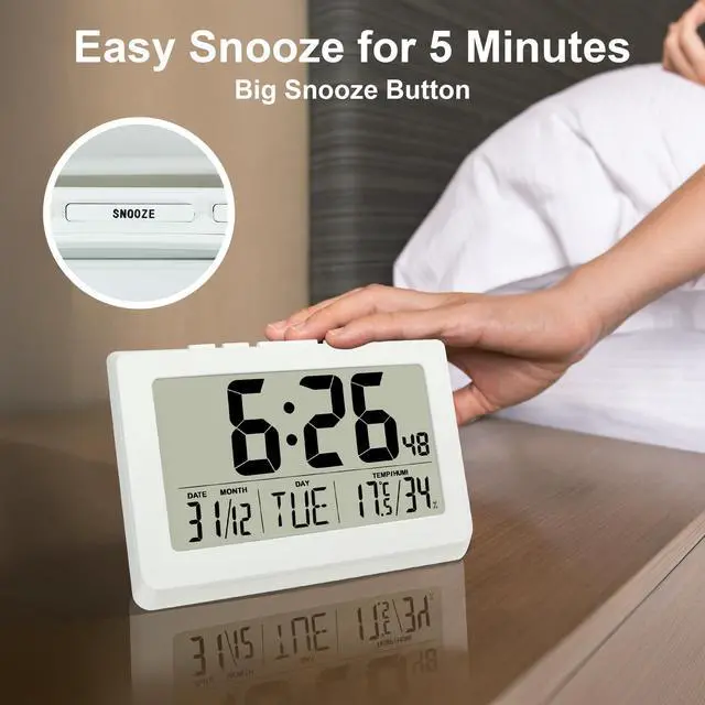 • Snooze Function: When the alarm rings, you can press the large "SNOOZE" button on the top of the digital alarm clock to take a nap for extra 5 minutes. If you don't require the snooze time, just press any of the other buttons at the top to stop the alarm.