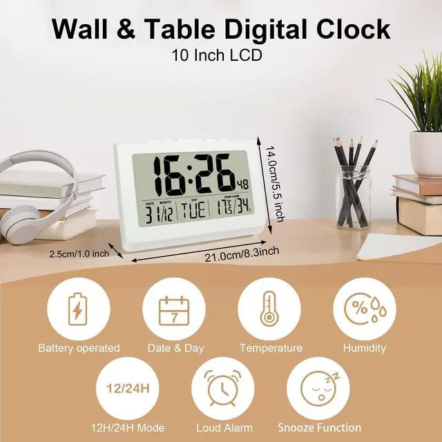 10" LCD Large Display Digital Clock, Wall Mounted and Desktop, Battery Operated Electronic Clocks with Date, Day, Temperature, Snooze Function for Elderly, Living Room Bedroom Office, White