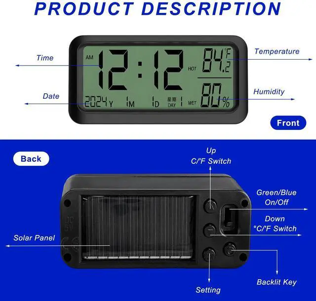 -The clock's clear display and buttons make it easy to switch and view the 12/24 hour format and °F /°C units.