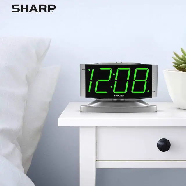 The Sharp SPC033 Digital Alarm Clock is an easy-to-use bedside alarm clock with a loud alarm and snooze, ideal for kids, teens, adults, and seniors. Jumbo red LED digits with adjustable high/low brightness make time easy to see day or night. This electric alarm clock plugs into a standard 120V outlet and includes battery backup for power outages. A swivel base allows clear viewing from any angle.
