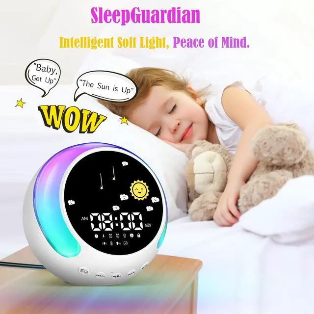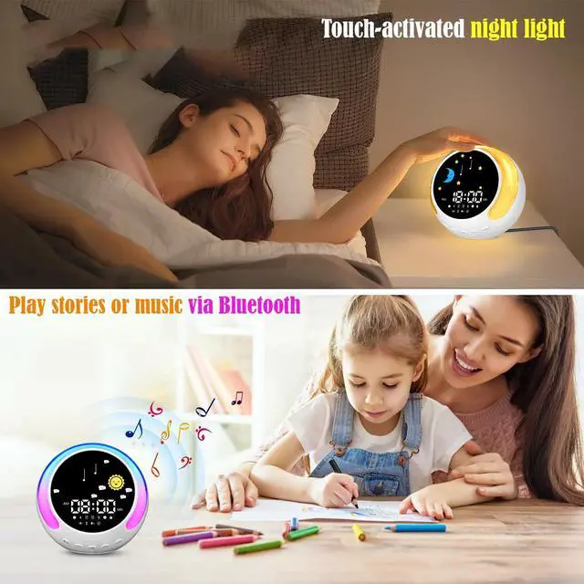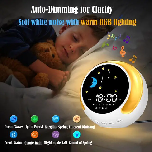 1. Bluetooth Speaker & Sound Library. Stream music or choose from 8 white noise soundscapes (rain, waves, etc.) for relaxation and better sleep.