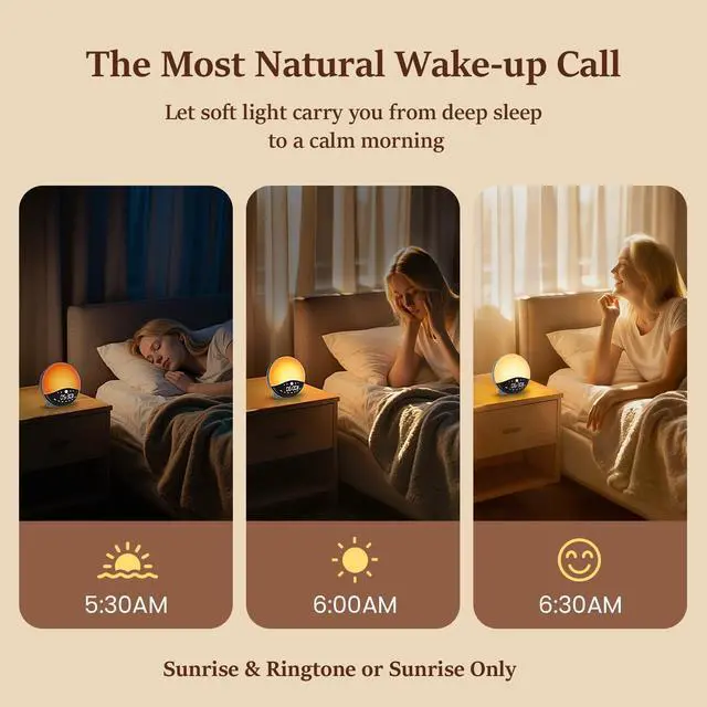 Sunrise Simulation, Gentle Wake-UpThe Lightoratory sunrise alarm clock softly simulates the glow of natural sunlight, gradually brightening your room from 1% to 100% over 0 to 60 minutes. This gentle sunrise simulation helps you wake up as if stirred by a quiet morning breezewithout the shock of harsh alarms. Start each day feeling calmer, more refreshed, and naturally energized.