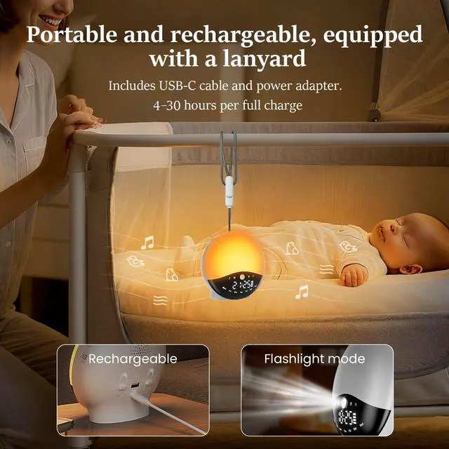 Wake Up Light Sunrise Alarm Clock for Bedrooms, Rechargeable Sound Machine Night Light, 28 Sleep Sounds, 12 Colors, Dual Alarms, White Noise Sound Machine for Baby and Adults