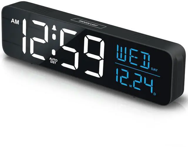 Large Display Digital Alarm Clock for Bedrooms, Date Day of Week Calendar Desk Table Clocks for Living Room Office, Dimmable Plug in Electric Clock, 5 Volumes, Loud, Auto DST