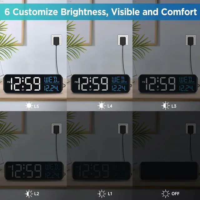 : 2-inch height of large numbers are friendly for seniors / elderly and people with poor eyesight. 5 different brightness settings ensure clock time is always visible in various lighting conditions: brighter and comfort in day or lower brightness at night for an improved sleep or completely off at night.