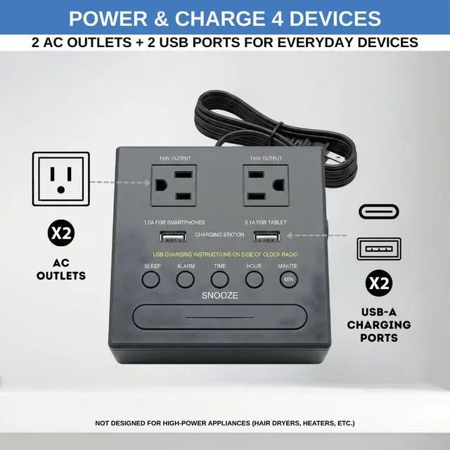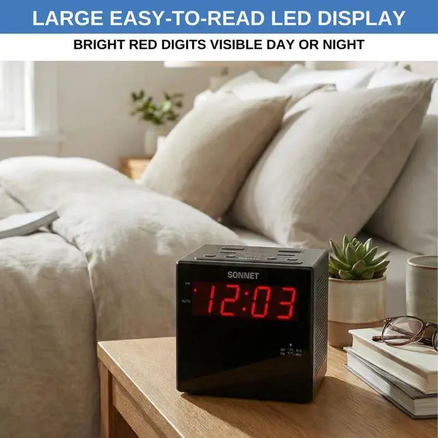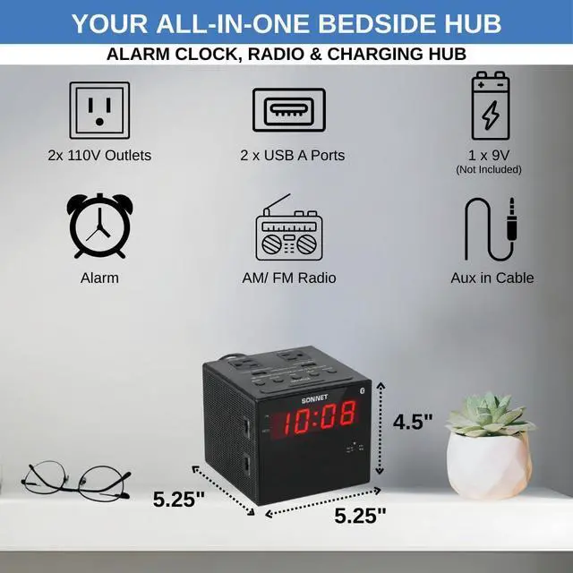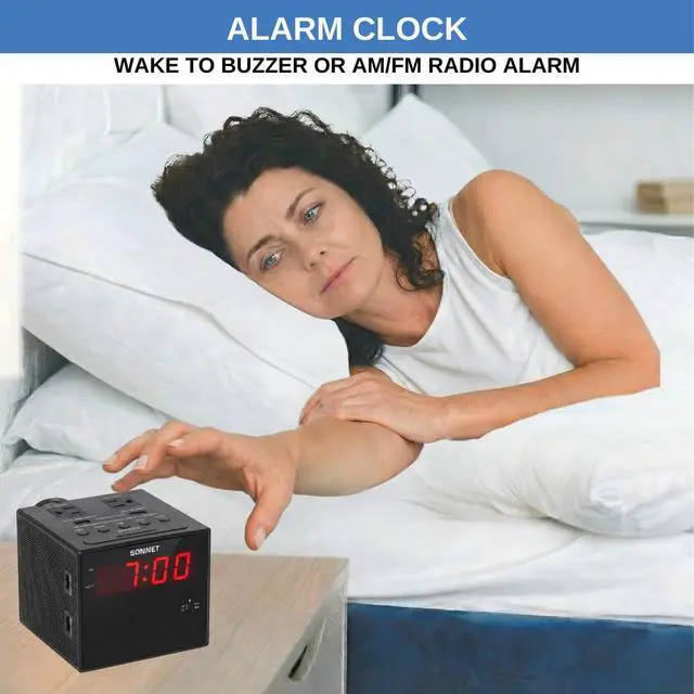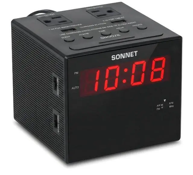 The Sonnet R-1414 Digital Alarm Clock Radio with Charging Station is a convenient all-in-one bedside solution designed for your bedroom, office, or desk. This compact clock radio combines a digital alarm clock, AM/FM radio, and multi-device charging hub in one space-saving design.