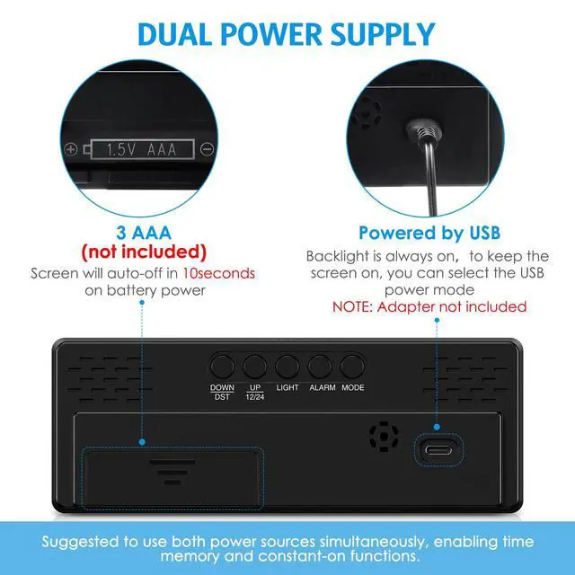 - When powered by batteries, the LED of alarm clock will be turned off in 10 sec, which can save power.