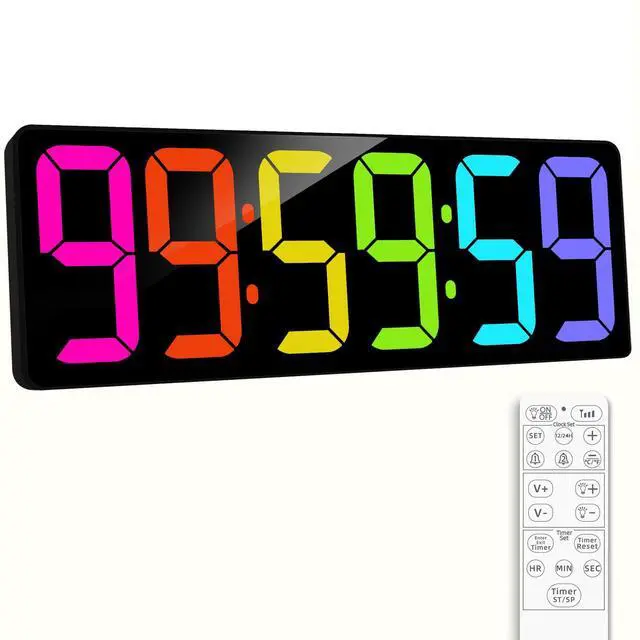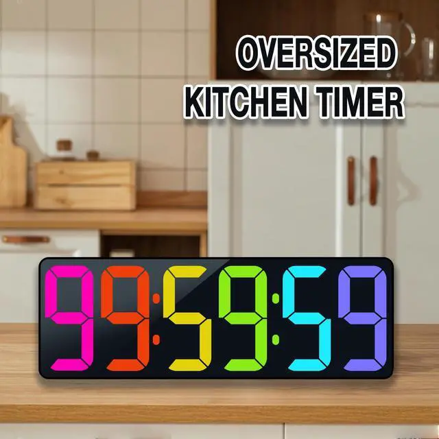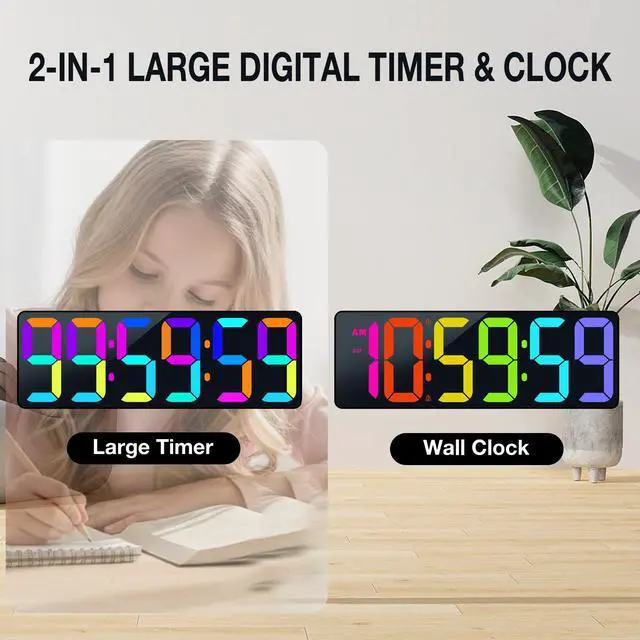 ALL-IN-ONE LARGE DIGITAL TIMER & CLOCK - It is not only a large wall clock but also a large digital timer. It defaults to timer mode when powered on. Unlike other small timers, the countup / count down timer features an extra-large size and highly visible digits, with colorful LED display and a stylish design