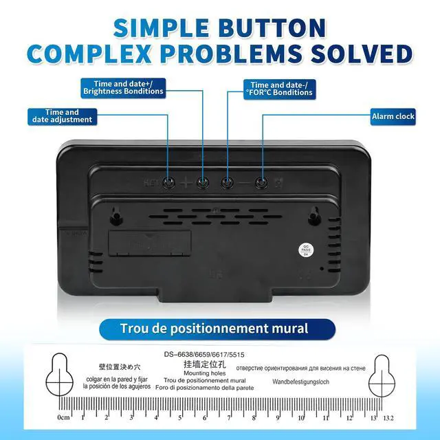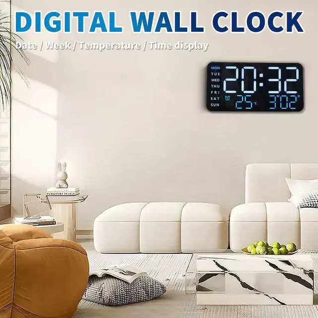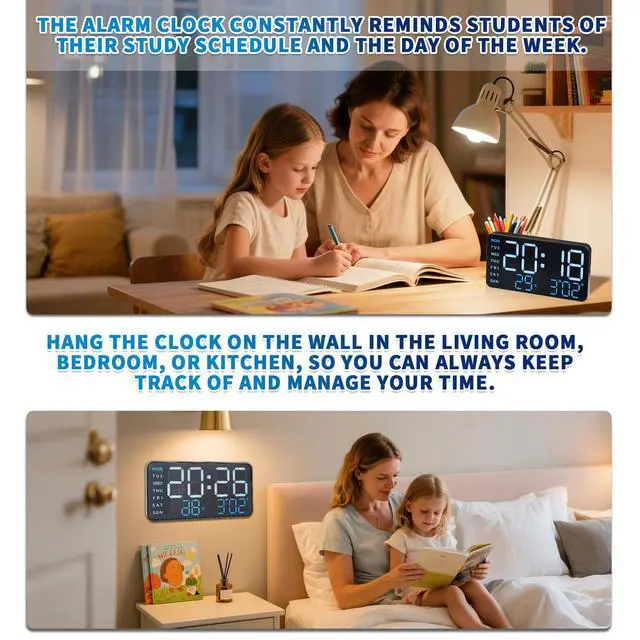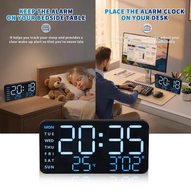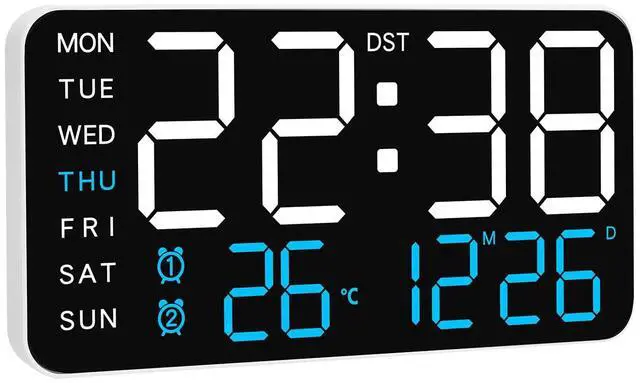 Complete Info at a Glance Week, Temperature, Date & Time Stay on schedule with this large digital alarm clock that shows the day, temperature, date, and time on its ultra-clear digital display. Perfect for bedroom study or work, you can manage your time better while keeping an eye on the display from your desk or wall. Never miss a moment with this all-in-one alarm clock.