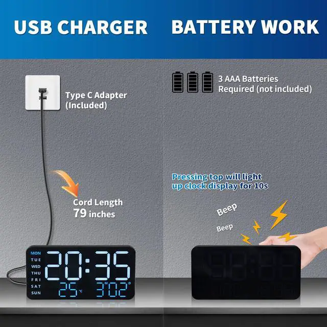 Flexible Power: 76-inch USB Cable + Battery Backup This large digital alarm clock offers dual power options: use the included 76-inch USB cord for 24/7 display brightness, or insert 3 AAA batteries (not included) for ecomodethe display lights for 10 seconds when tapped. The long USB cable makes it easy to place on a desk, table, or mount on a bedroom wall. Note: AAA batteries are sold separately.