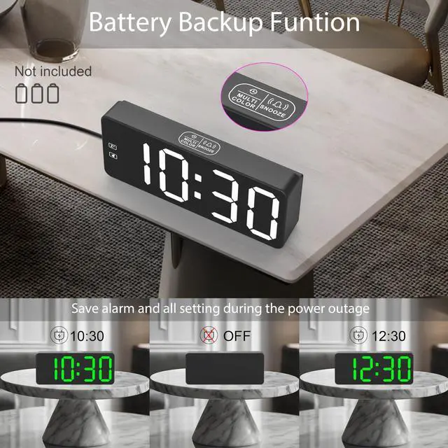 BATTERY BACKUP & OUTAGE PROTECTION Never miss an alarm during power failures. Insert 3 AA batteries (not included) to keep time and alarm settings safe. If the power goes out, the display turns off to save battery, but the alarm will still sound at your set time. When power returns, everything works instantlyno reset needed.